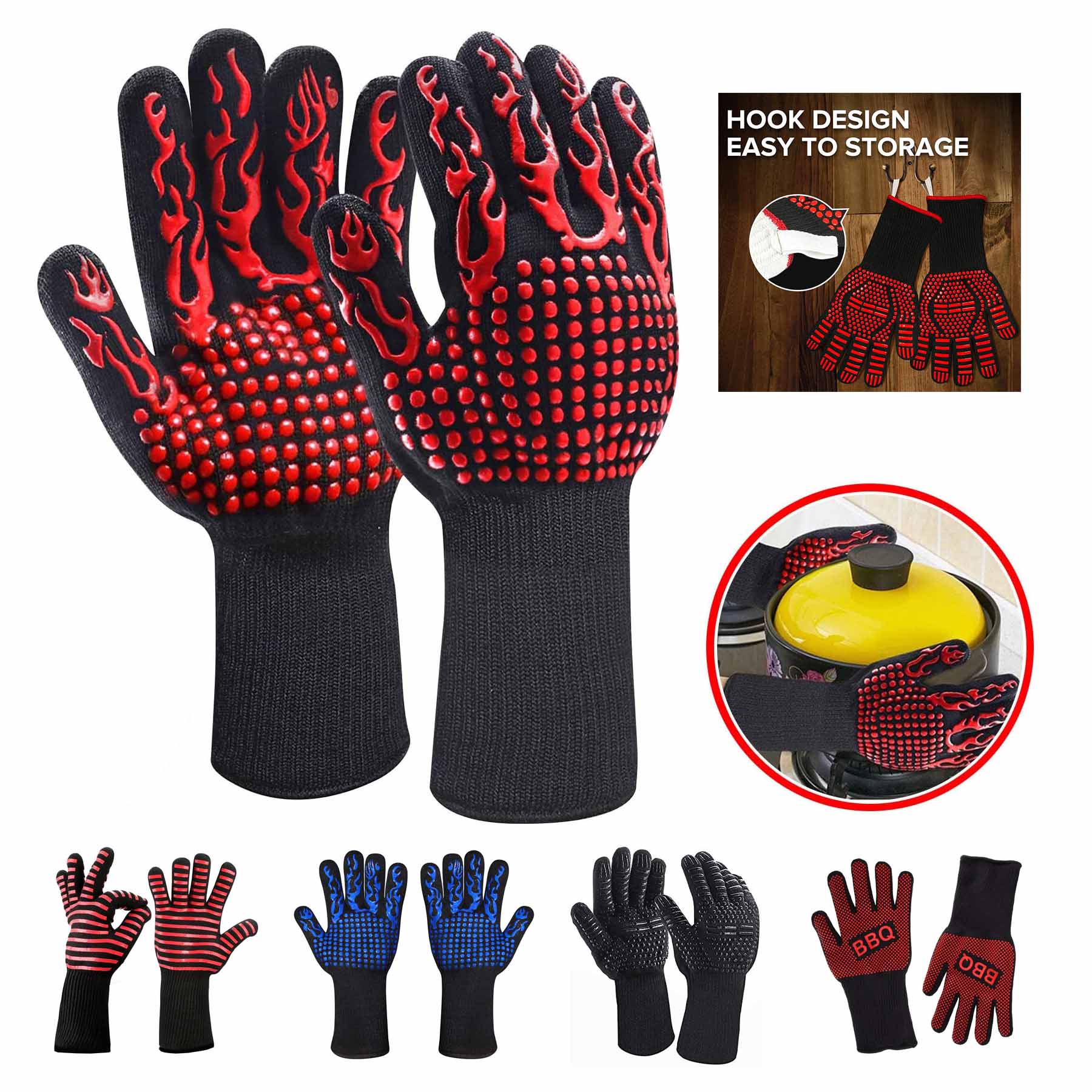 A very useful gloves that you should not miss! Grilling gloves is made of fireproof fiber, cotton and silicone material. It is heat-resistant, fire proof, and anti-slip. It is great for cooking, grilling and so on. The silicone pattern of the palm and back can be customized. 13″ L x 7″ W