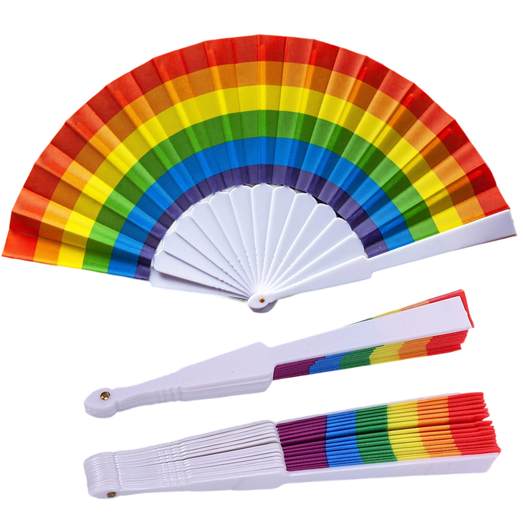 This rainbow folding fan is crafted from ABS plastic and polyester fabric. With a distinctive flick-of-the-wrist opening mechanism, they produce a satisfying clicking sound and showcase vibrant colors that attract attention. Features a large single side imprint area and foldable design. Ideal for cooling during hot summers, they serve as versatile accessories for stage performances, dance events, weddings, cosplay, and daily use, combining durability with eye-catching aesthetics. 9″ L