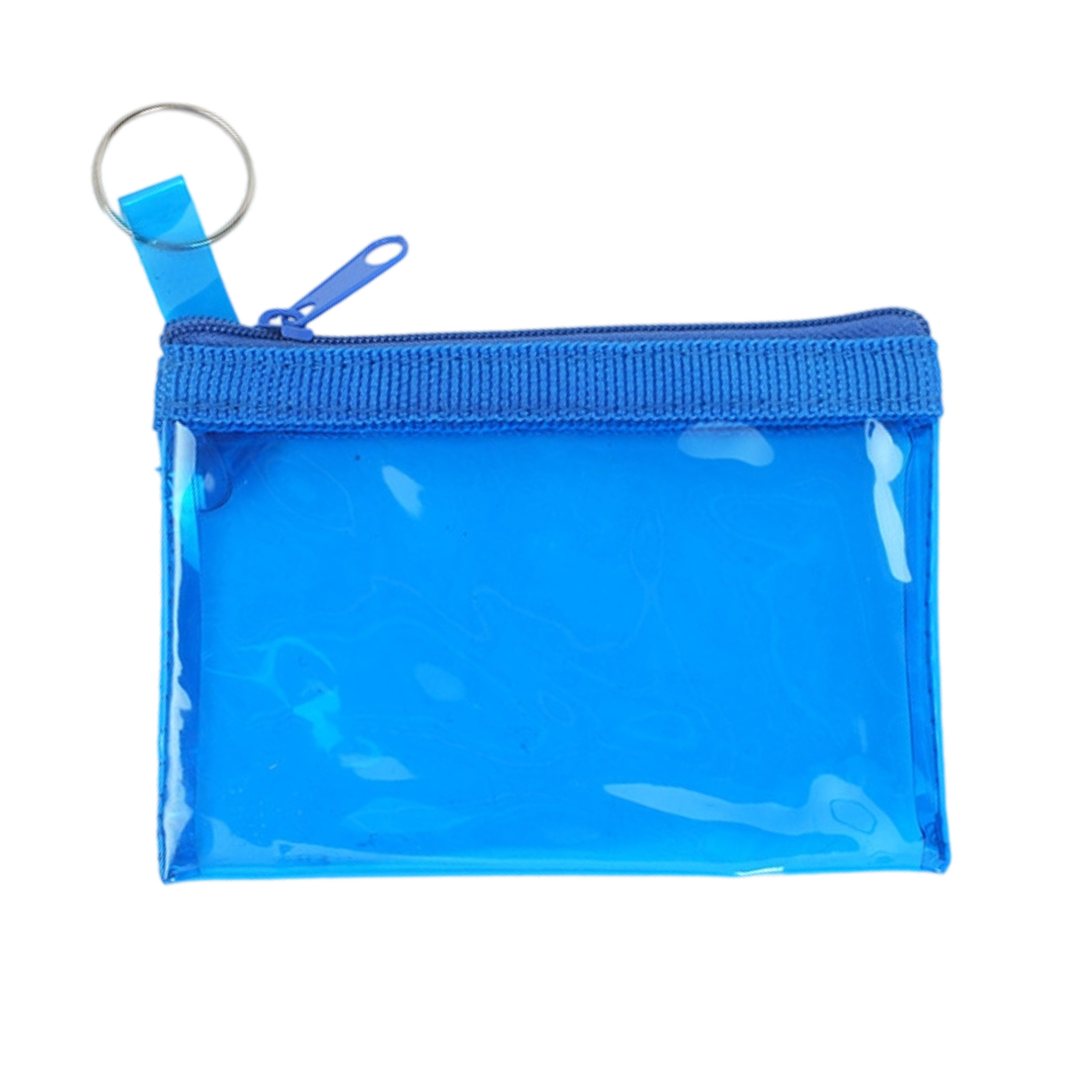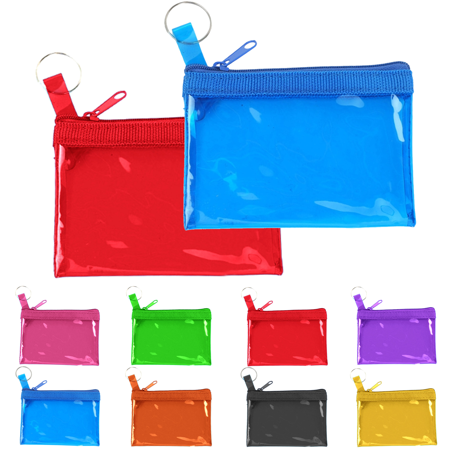 Zippered wallet is made of transparent pvc material with keyring to keep personal belongings like change, keys, coins, ID cards and earphones in it. The zipper closure can protect the items from falling out. You can customize your logo on the front and back of the wallet. 4 5/8″ L x 3″ W