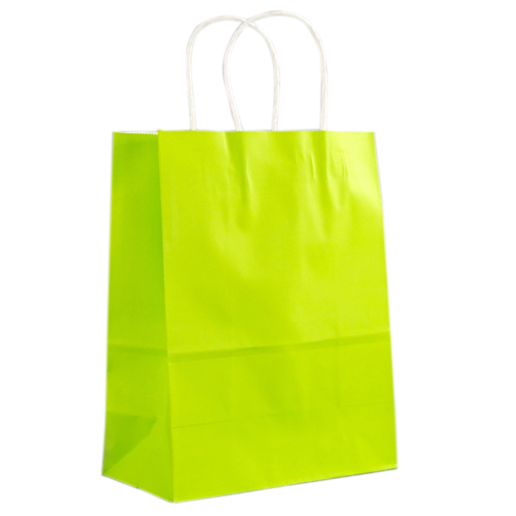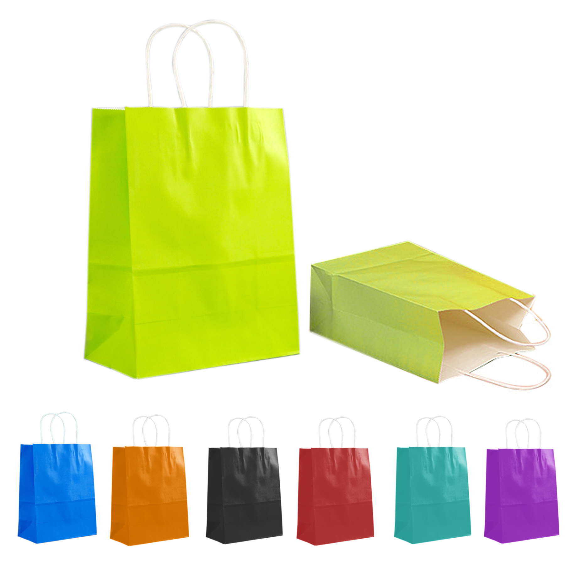 This bag is made of white kraft paper. Features two round twisted paper handles and a 5″ gusset . You can choose different colors of handles. Edge-to-edge full-bleed printing makes it an exceptional promotional product. Both flat and serrated cut top are available. 10″ L x 13″ H x 5″ W